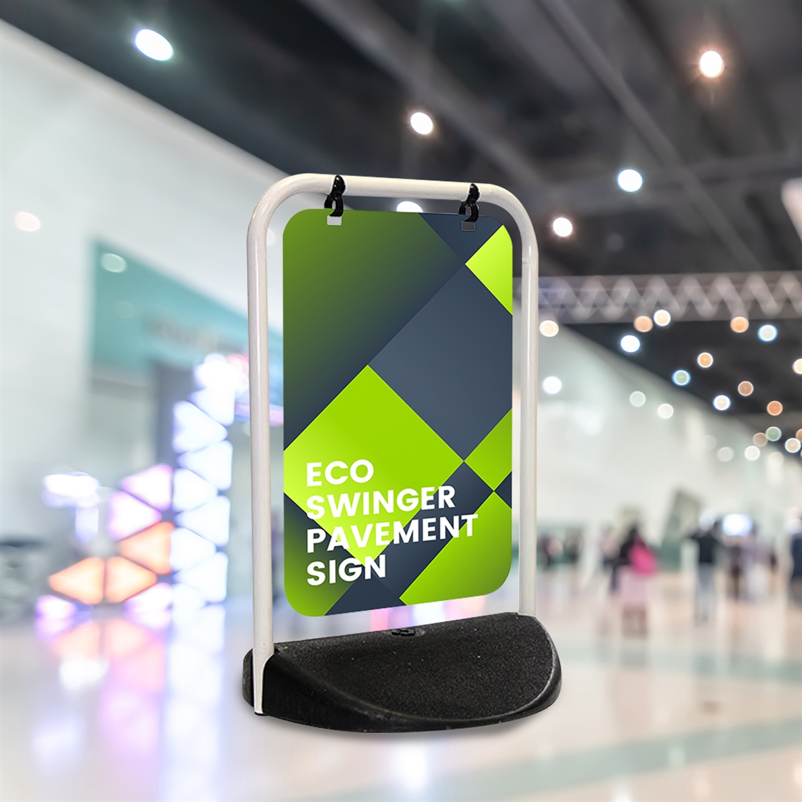 Eco Swinger White is an excellent way to promote shops and restaurants. It includes a full colour graphic on both sides, with the option of replacement panels.