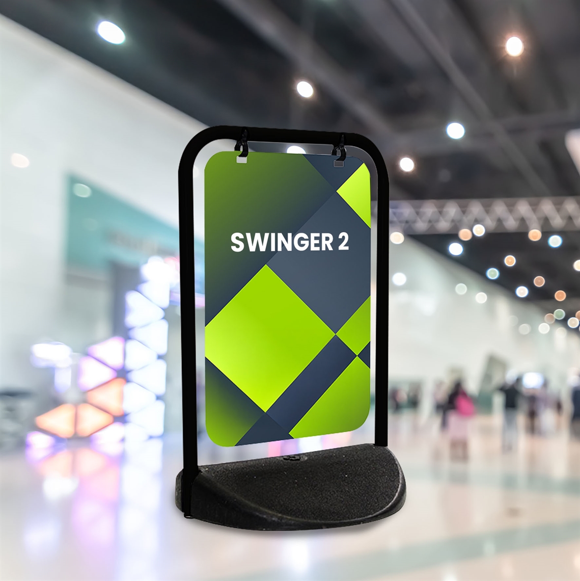 Swinger 2 - Black is an excellent way to promote shops and restaurants. It includes a full colour graphic on both sides, with the option of replacement panels.