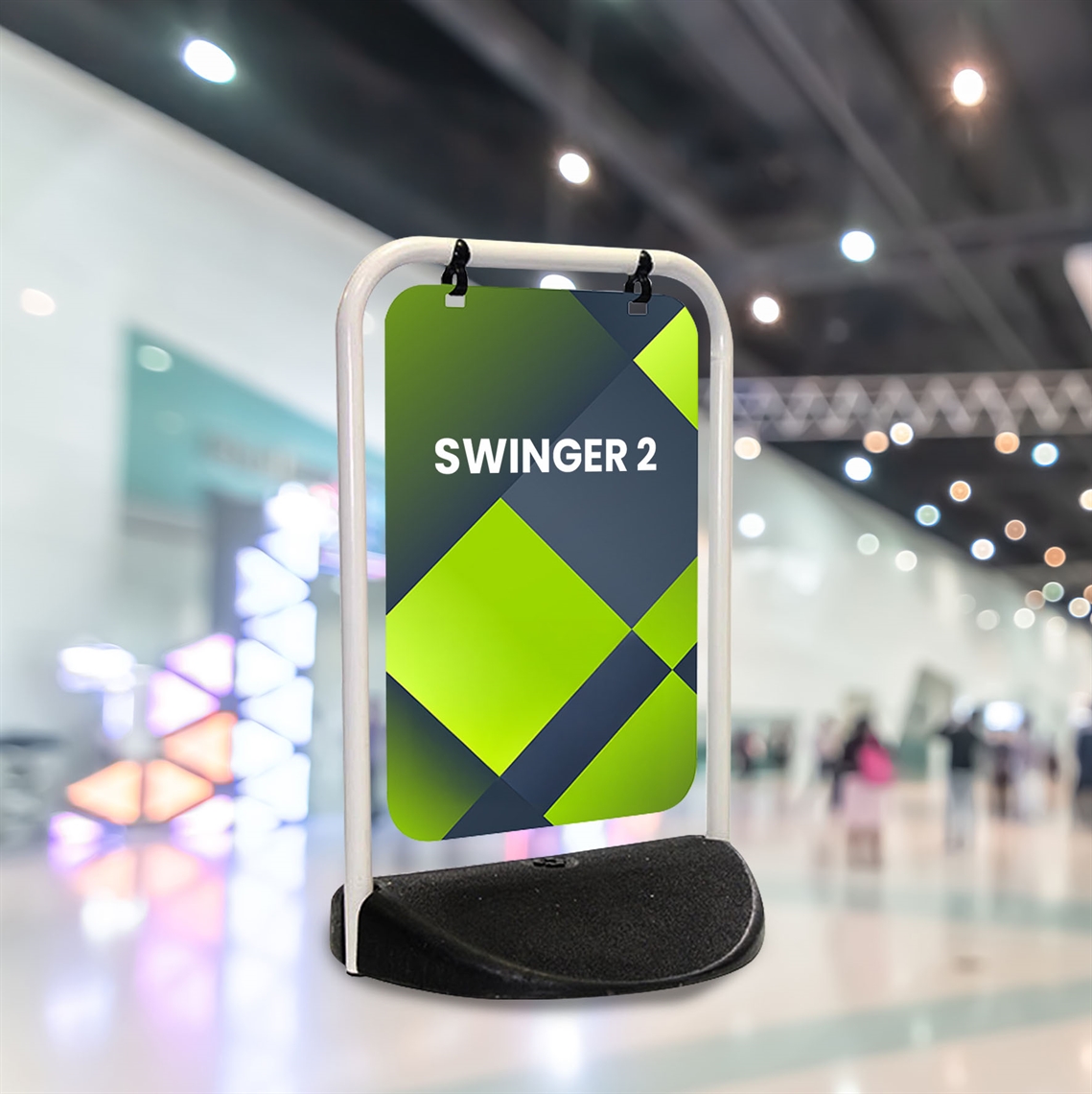 Swinger 2 - White is an excellent way to promote shops and restaurants. It includes a full colour graphic on both sides, with the option of replacement panels.